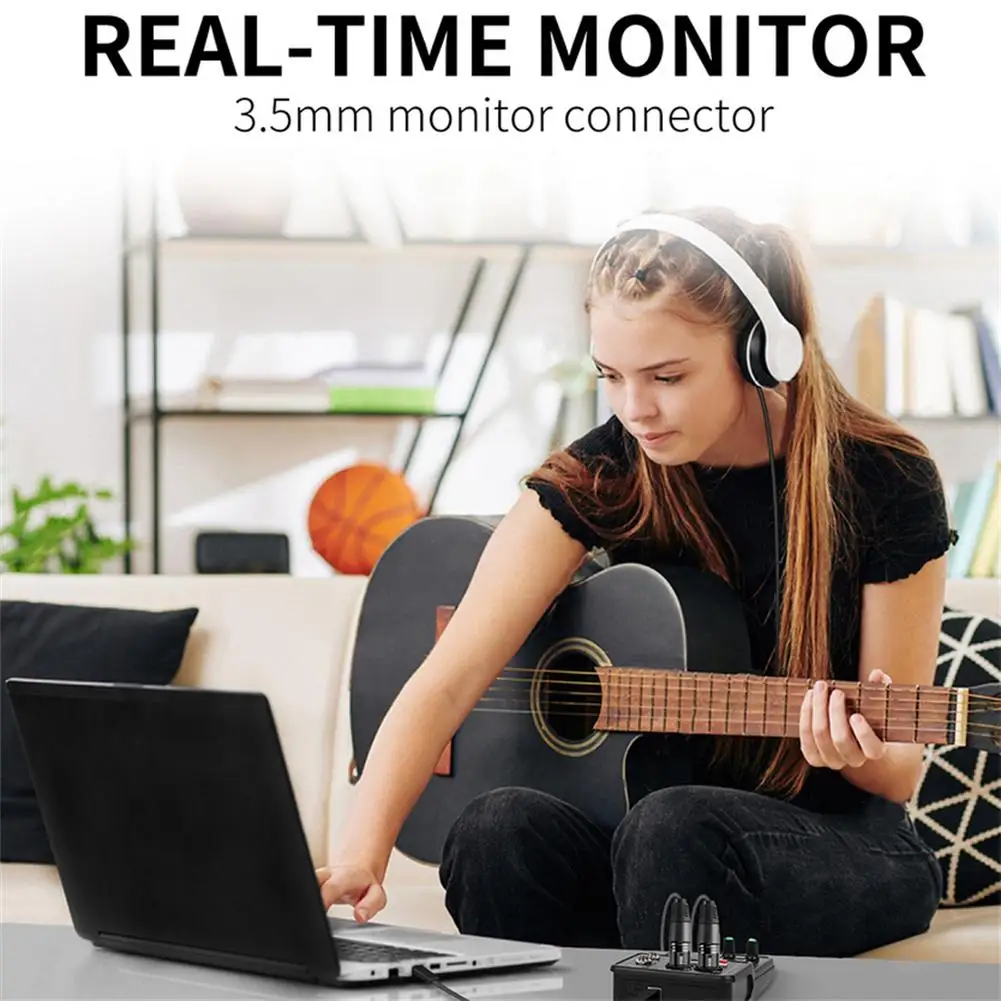 3. Driver-free installation: Installation and wide compatibility Connect the q12 sound card to the computer to support plug-and-play without the need to install drivers. (Note: If you have special recording needs, you can install [asio4all] by yourself). It is compatible with most recording software such as Reaper, Audacity, Garageband, Cubase, Ableton Live, etc. The q12 sound card gives you new freedom to record, edit and mix, and any audio you record is studio quality, meaning you don't have to go to the studio to re-record later.